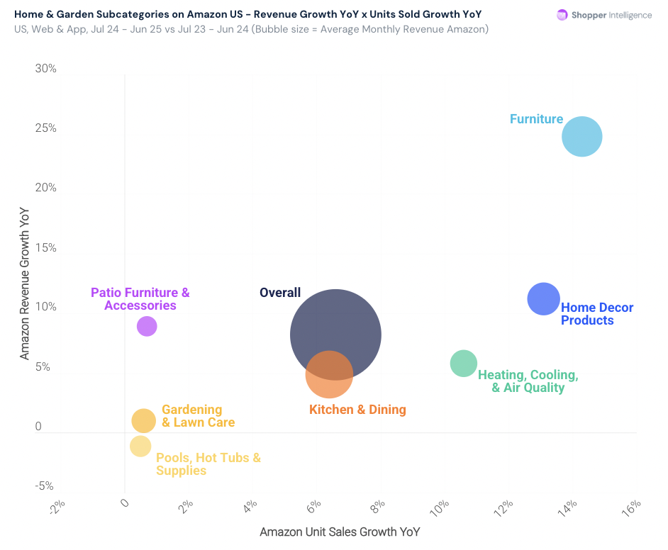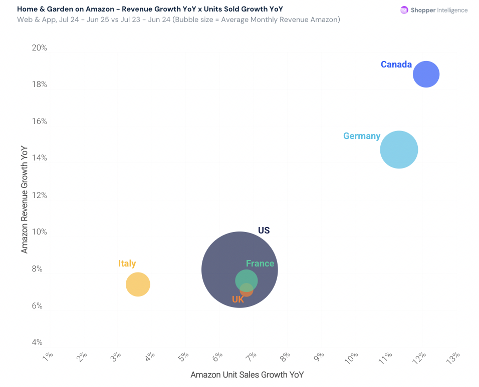在亚马逊的主要市场中,法国表现最为突出,营收和销售量同比增长最快。意大利与加拿大同样实现了两位数的销售增长,市场接受度与用户活跃度双双上升。美国作为亚马逊最大的市场,增长趋缓,客户群已高度饱和。英国维持稳步增长,而德国则趋于停滞甚至下滑。
