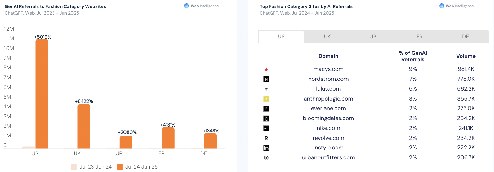 人工智能正在重塑用户获取模式。数据显示,美国在AI驱动的推荐流量方面居于领先地位,这与其在整体市场访问量上的优势相符。然而,德国的表现尤为突出,其在推荐流量增长中排名第一,总推荐量位居第二,尽管其整体市场访问量仅排名第七,落后于英国。