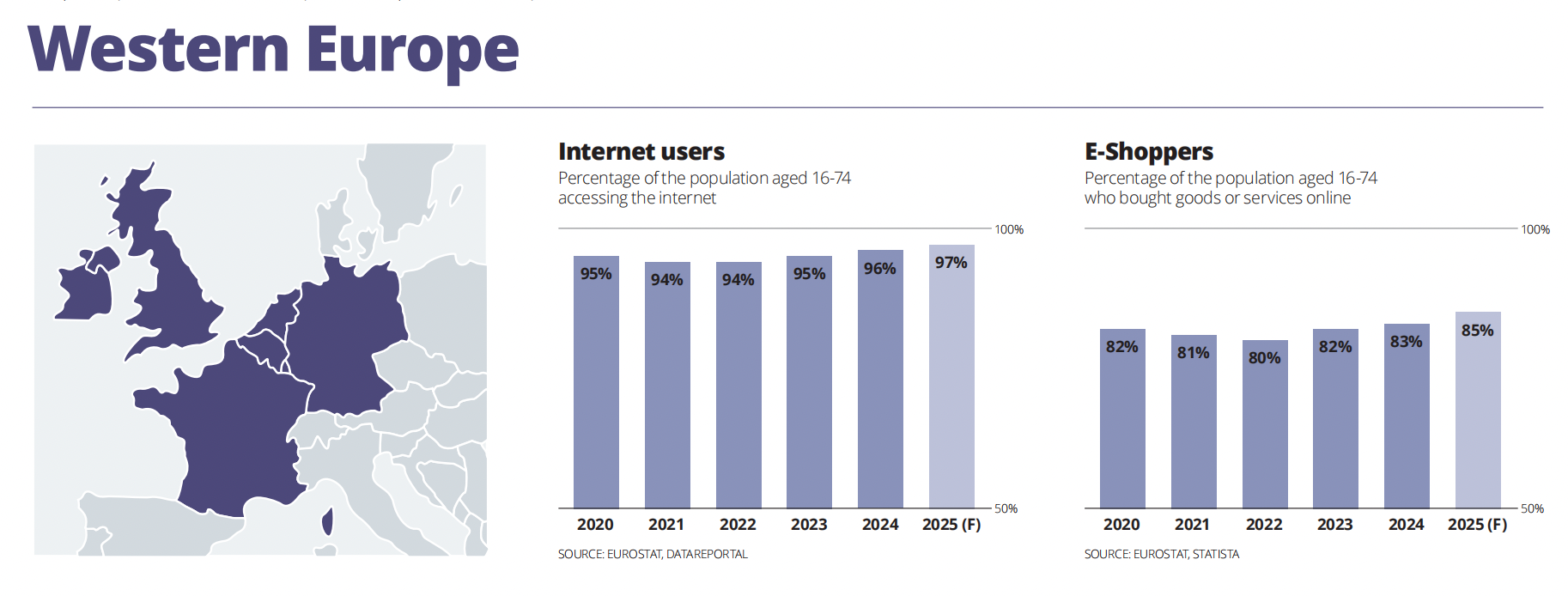 与此同时,网络购物者比例持续走高,从2020年的95%升至2024年的96%,预计2025年将达到97%。这表明,线上消费已成为西欧居民的主流购物方式,电商生态体系的成熟度正不断提升。