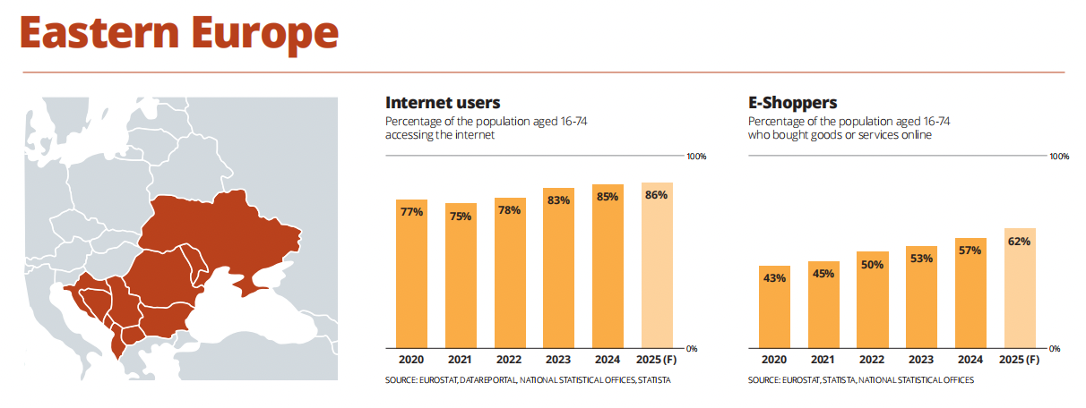 东欧国家的互联网使用和电商参与呈现明显差异。阿尔巴尼亚互联网用户比例从2020年的74%升至2024年的88%,网络购物者比例从14%增长至38%,预计2025年将达43%。