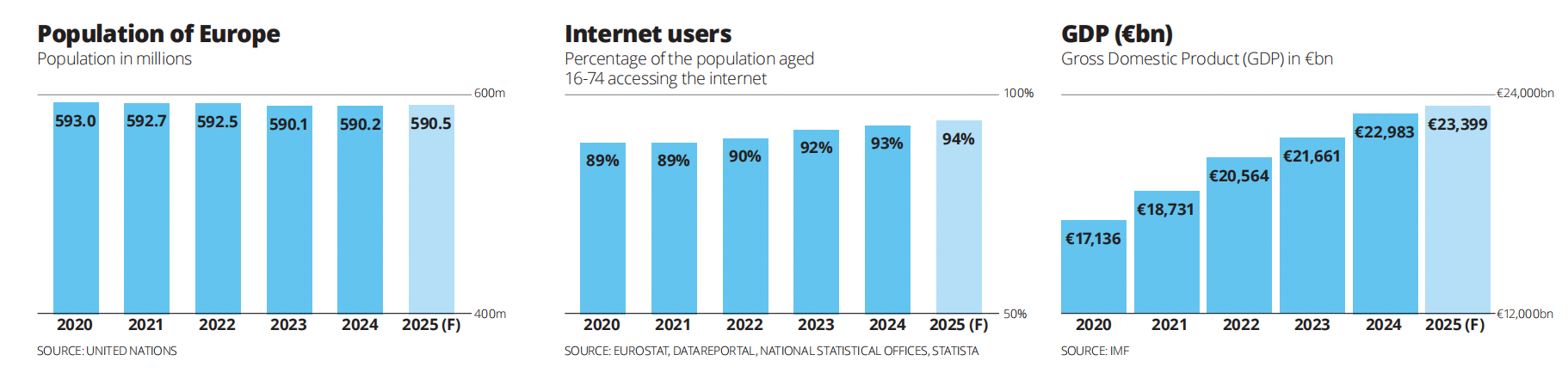 互联网普及率持续上升,2024年已达93%,预计2025年将进一步提升至94%。与此同时,欧洲GDP从2020年的17.1万亿欧元增长至2024年的22.98万亿欧元,2025年预计将达到23.4万亿欧元。