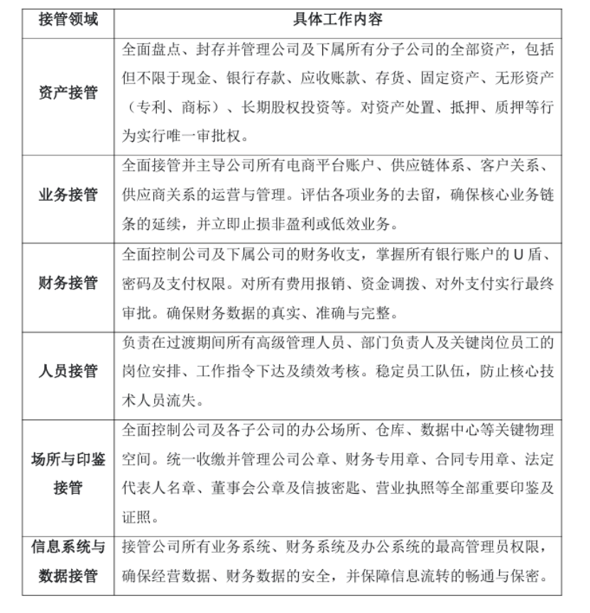 10月10日,董事会审议通过了《关于全面接管公司资产、业务、财务、人员、场所等事项的议案》,授权成立接管工作组实施统一管理。接管范围涵盖资产、业务、财务、人员、场所与印鉴、信息系统与数据六大领域。