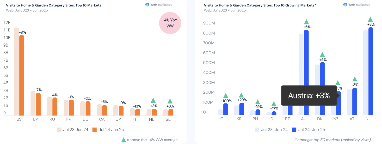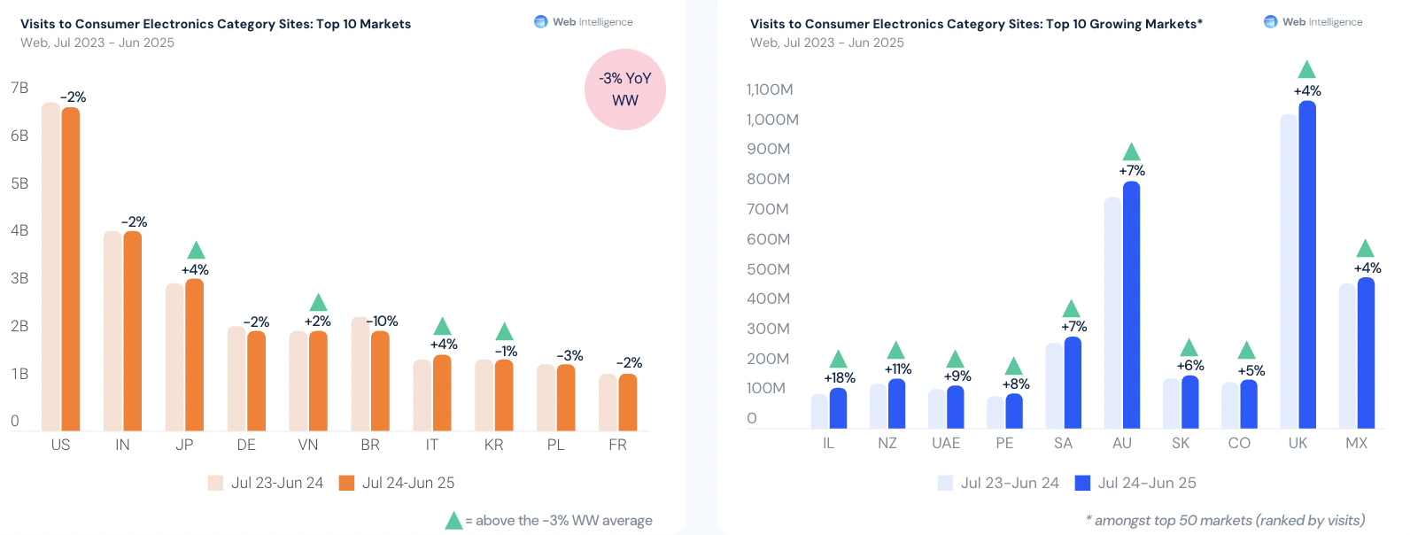 从国家层面看,美国、日本与英国仍居访问量前列,访问量出现小幅下降,意味着市场已进入成熟期。巴西则在访问量与增长率上均表现突出,其互联网普及率推动增长。智利与哥伦比亚等新兴市场增速最快,互联网普及和线上零售选项增加共同推动了其强劲增长。