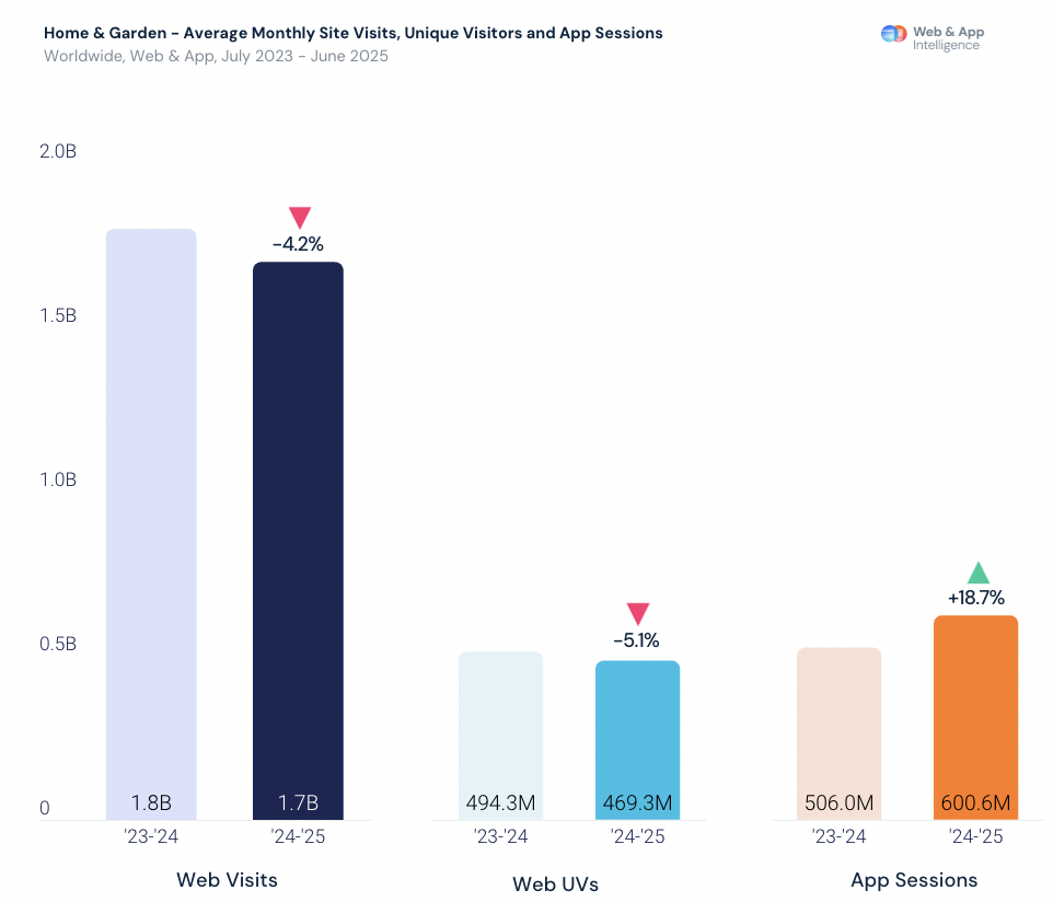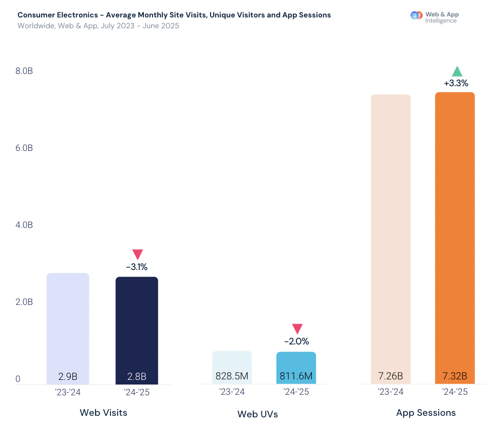 过去两年,全球电商流量整体保持稳定,每月访问量约为210亿至270亿次,同比略降1%。独立访客数同比增长1%。移动端应用内会话同比增长13%,11月与12月的假期购物高峰期带动访问激增。消费者的购物方式正从频繁的网页浏览转向移动端交互,品牌自有应用成为培养忠诚度的核心渠道。