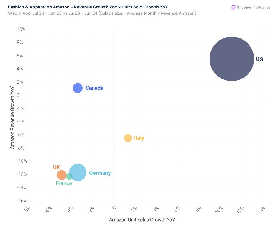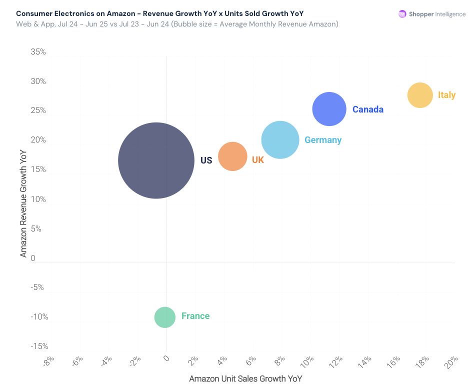 在亚马逊的主要市场中,法国表现最为突出,营收和销售量同比增长最快。意大利与加拿大同样实现了两位数的销售增长,市场接受度与用户活跃度双双上升。美国作为亚马逊最大的市场,增长趋缓,客户群已高度饱和。英国维持稳步增长,而德国则趋于停滞甚至下滑。