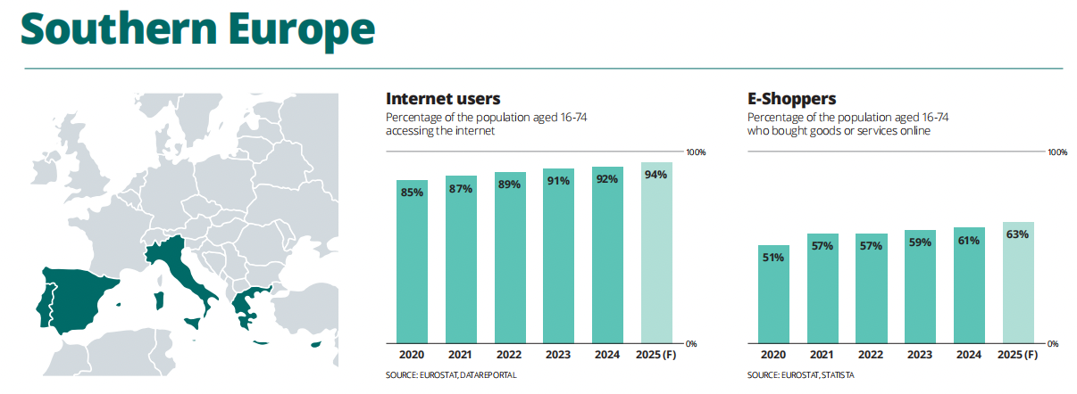 虽然与欧洲其他地区相比,南欧市场的网购者占比仍然较低。随着互联网覆盖率提高、消费者数字素养增强以及物流和支付基础设施改善,南欧市场正成为欧洲电商增长的重要动力源。
