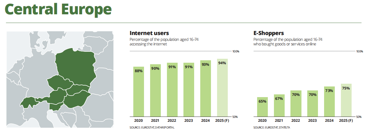 中欧市场包括奥地利、捷克共和国、匈牙利、波兰、斯洛伐克共和国、斯洛文尼亚和瑞士。近年来,中欧地区的数字化程度持续加深,互联网和电商渗透率稳步提升。数据显示,2020年至2024年间,中欧16至74岁人群的互联网使用率从88%上升至93%,预计2025年将进一步达到94%。