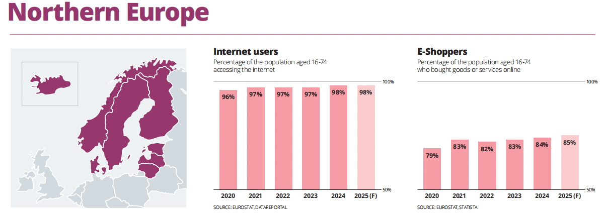 北欧消费者线上购物接受度极高,2025年,瑞典和芬兰线上购物者占比预计超过92%,丹麦和冰岛约90%,挪威88%,爱沙尼亚、拉脱维亚和立陶宛均超过80%。北欧市场呈现出“几乎全民电商”的格局,线上消费已成为日常生活的核心组成部分。